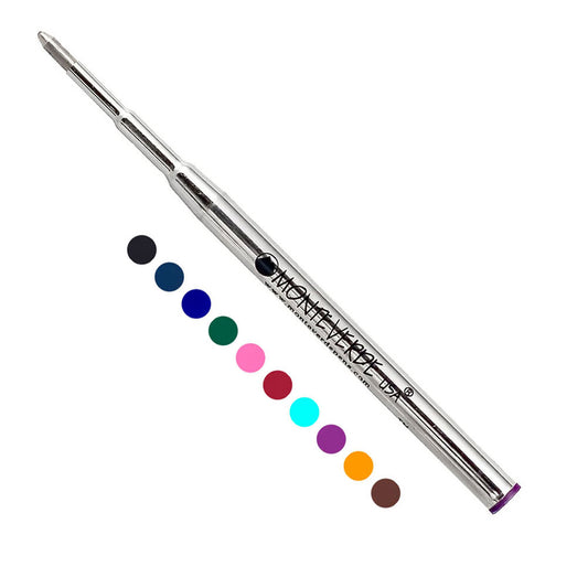 We are very proud to feature these Monteverde refills for Montblanc ballpoint pens. Two ink types are offered, gel or liquid. Gel ink is more viscous so you will lay down more ink with each stroke. The point size, fine, medium or broad, determines the width of the line on paper. Monteverde liquid ink refills for Montblanc are water based, like the gel. They write smoothly and the colors are quite vivid. We also offer a mini ballpoint refill that will fit Montblanc multi-pens. These refills are loaded with state of the art liquid or gel ink. It is designed to wick onto paper. If it comes in contact in anyway with cloth it will drain itself by design.