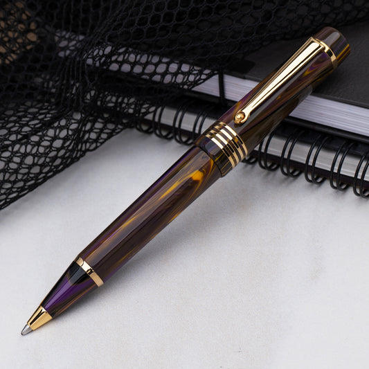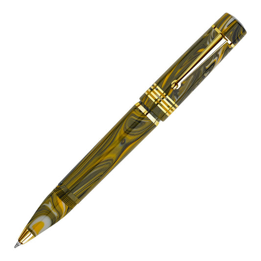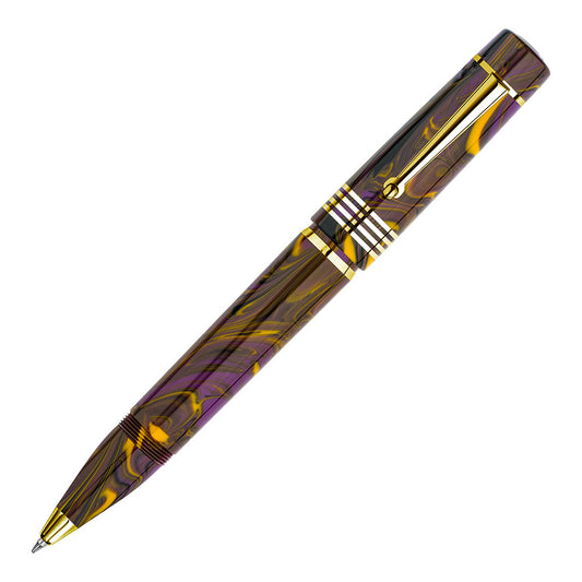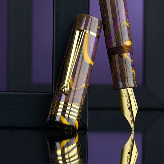 Available in fountain pen, rollerball and ballpoint. Choose this custom resin in Iris or Marigold. Both resins are unique; no two are alike. Delta’s steel nibs lay down an effortless line of ink. The rollerball is a liquid ink joy. The ballpoint is a twist-top and ready to write.