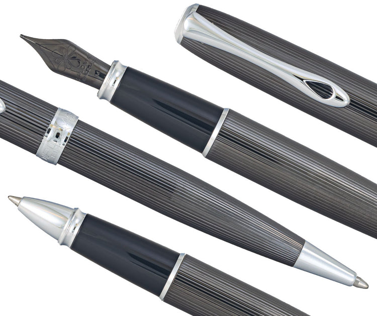 The fountain pen’s black chrome nib is available in extra fine, fine, medium, and broad. The Diplomat steel nib flows effortlessly. A converter is of course provided for bottle ink. The rollerball accepts the standard international refills. The twist to deploy ballpoint accepts our most common refill. Colors and technologies galore.
