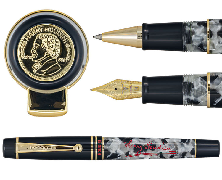 The Harry Houdini Limited Edition is available as both a fountain pen and rollerball.  Each fountain pen features a German 14k gold plated steel nib in both fine and medium point. It utilizes a cartridge/convertor filling system. The rollerball uses a standard International refill. Each pen is packaged in a special commemorative Harry Houdini box.