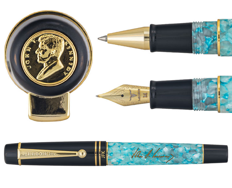 The John F. Kennedy Limited Edition is available as both a fountain pen and rollerball. Each fountain pen features a German made 14kt gold plated nib in either fine or medium point and utilizes a cartridge/convertor filling system. The rollerball uses a standard international refill.