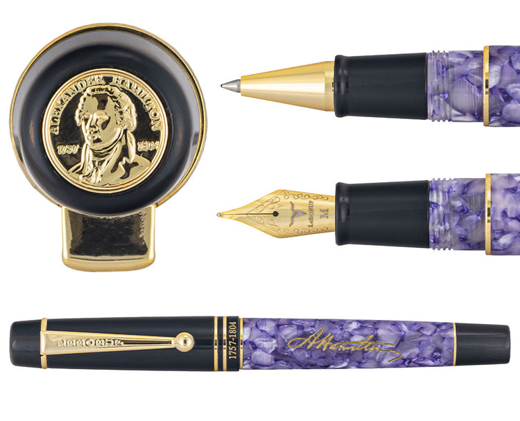 The Alexander Hamilton Limited Edition is available as both a fountain pen and rollerball. Each fountain pen features a German made 14kt gold plated nib in either fine or medium point and utilizes a cartridge/convertor filling system. The rollerball uses a standard international refill.
