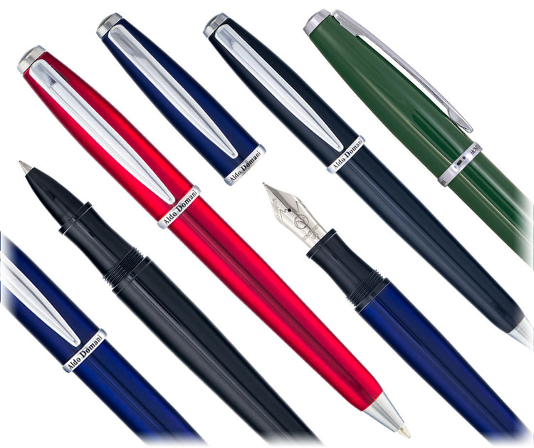 The Monteverde Aldo Domani Collection features nicely weighted, full-sized fine writers at prices we never dreamed were possible. The fountain pens, rollerballs and ballpoints are offered in stately black, warm green or deep blue. The shiny lacquer is then trimmed with chrome and topped with a black end piece. Two-piece pens have screw-on, not click caps. The ballpoint is a convenient twist top. Perfect for business promotions or gifts for co-workers, friends and family.