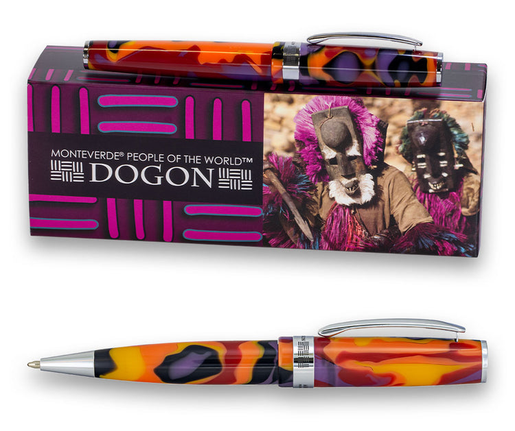The unique attire, colors, and traditions of the Dogon people inspired the design of Monteverde USA® Dogon pen collection. The primary inspiration was the Dama dancer’s attire which can be noted in the colors of the exclusive custom hand-made and mixed high-quality resin; the mix of fuchsia pink, golden yellow, brown, and green colors are all pulled from traditional costumes and mask designs of ceremonial attires. The pen is accented with chrome trim and a polished ring, engraved with the name of the people – “Dogon” and traditional ornaments.