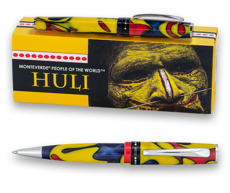 The unique appearance, colors, and traditions of the Huli people inspired the design of the Monteverde USA® Huli pen collection. The primary inspiration was the body paint used by the people which can be noted in the colors of the exclusive custom hand-made and mixed high-quality resin; the dominant beaming yellow and red patterns that are also combined with dark blue color that takes its inspiration from the wig elements such as bright blue feathers, often used in wig designs by the men of the Huli people.