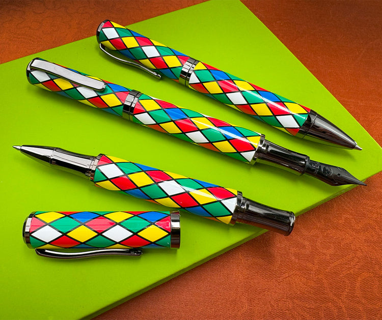In the spirit of this rich tradition, the pen's design is a celebration of sharp lines and intricate patterns. The meticulously crafted yellow/blue/red/green/white and black harlequin motif adorns the pen's body and cap, creating a mesmerizing interplay of bright colors.