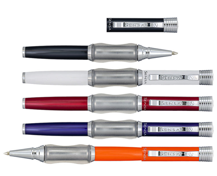 The new owners of Sensa have revived the brand, developed 21st century materials for the Patented Plasmium ™ fluid gel grip section and updated colors. Each Sensa two-piece rollerball pen is made from brass and then lacquer coated in fashion colors. A milled silver plated pen top with the Sensa logo completes each pen. You can choose to post the cap or write with just the comfortable body. Sensa takes writing to a new level of comfort. Sensa’s introduction of liquid ink rollerball writing takes it even further.