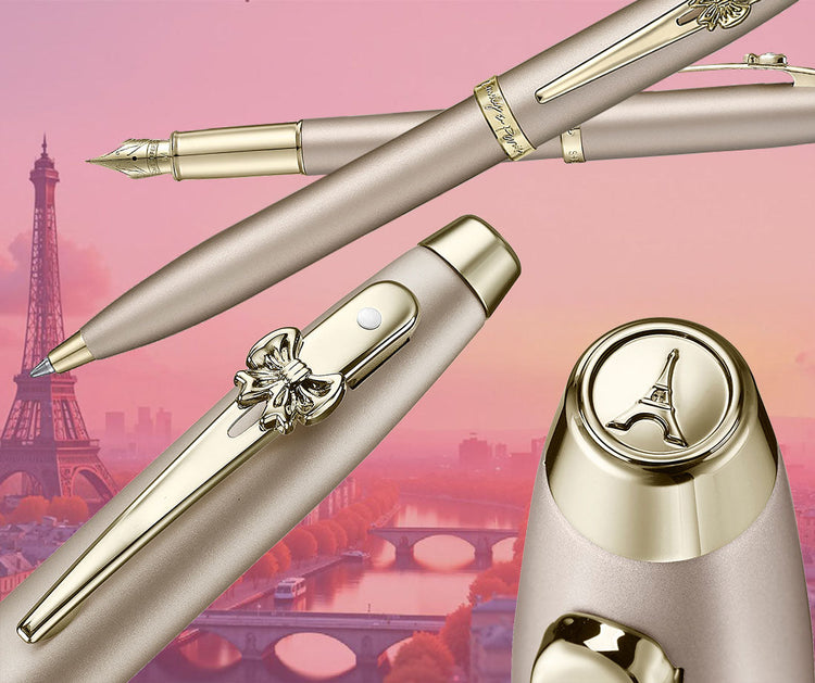 The Sheaffer Emily in Paris 100 series features elegant champagne lacquer with gold toned trims in a twist-top ballpoint, capped rollerball or capped fountain pen with a fine or medium stainless-steel nib. The top is crowned with an Eiffel Tower image. The clip is adorned with the iconic Emily bow. All these options mean an exceptional writing instrument at an affordable price.
