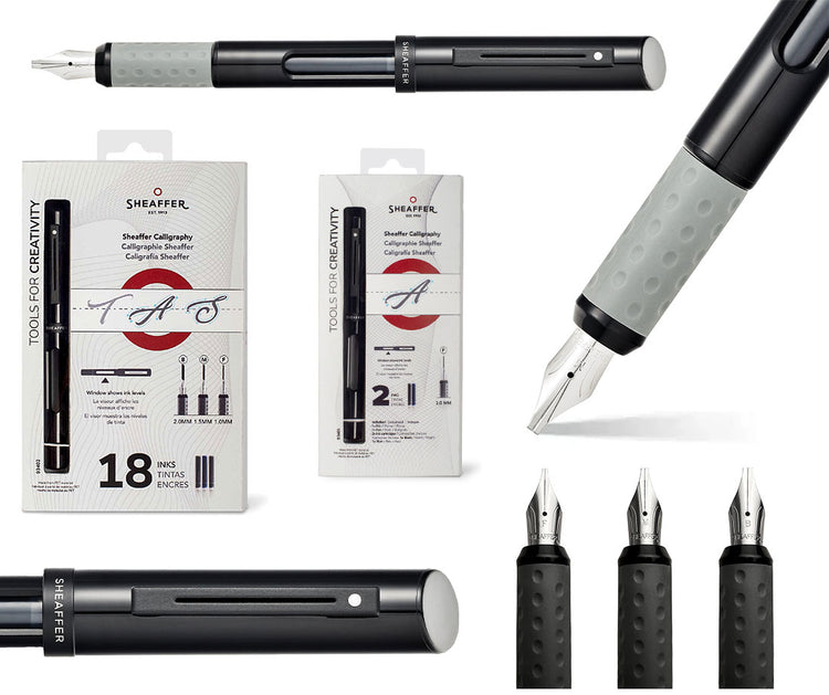 The Sheaffer Calligraphy Collection features either a hard-wearing resin barrel in different nib sizes or the Maxi Set with three full pens and 24 ink cartridges of different colors.