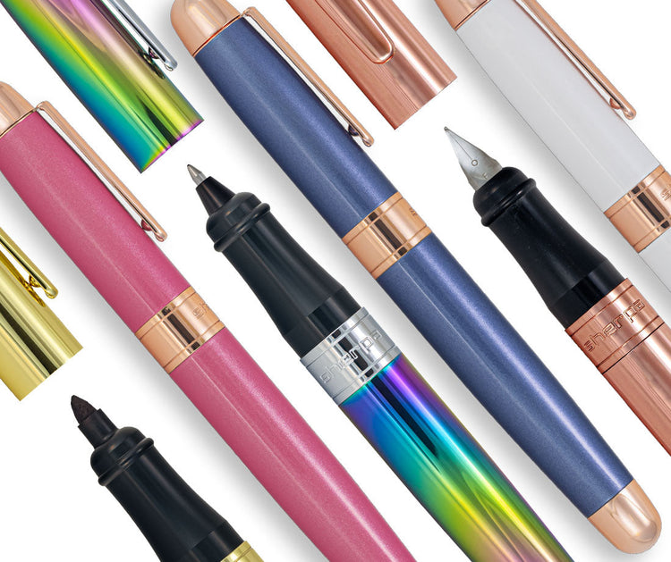 The pens in this series are adorned with finishes creating a visual symphony beyond the ordinary. Each finish – Sapphire Shimmer, Sparkling Rosé, Copper Burst, Prism Break, Gold Slick and Arctic Aurora – is a masterpiece of color and depth. The marriage of these magnificent hues with radiant trim elevates the collection to new heights, making each pen a statement of refined taste and style.