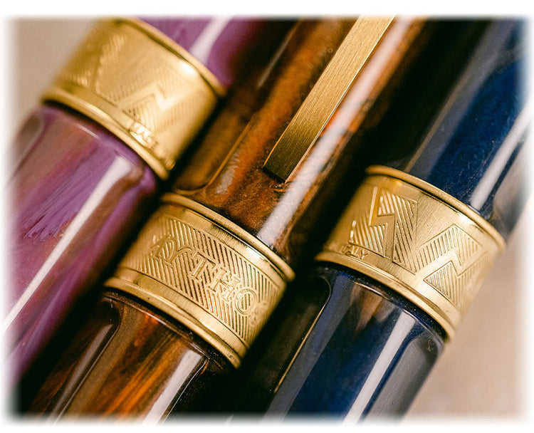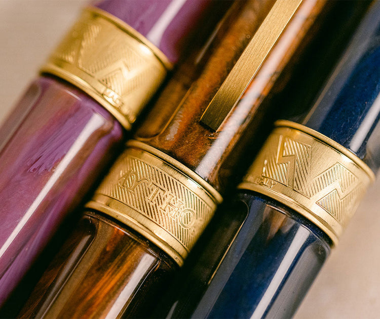Notice the center ring engraved with the inscription, MYTHOS and a V to represent a stylized Mount Olympus. Most convenient is the strong magnetic closure on the two-piece bodies. The grip section has a sandblasted finish. The acrylic resins chosen for this series are unlike any other previously from Visconti.