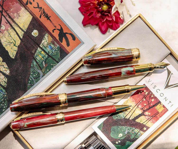 The Flowering Plum Orchard collection has yellow gold plated metal fittings which add light to the red, green and brown acrylic resin. Please note! No two Visconti van Gogh pens are alike. Each is made from a custom resin with unique flows of color. Every piece has a totally different display of the wonderful colors of this Master.