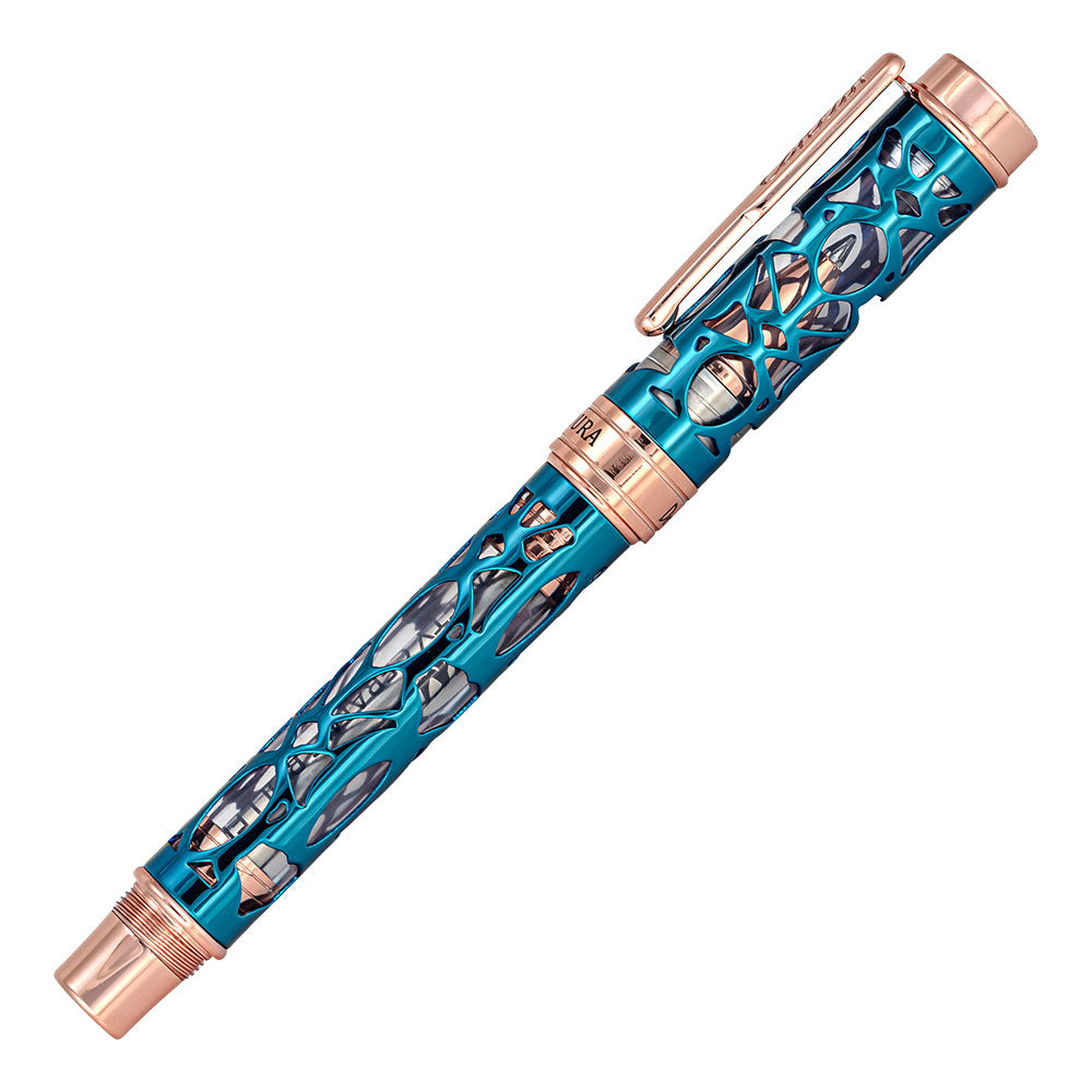 The collection is available in three gorgeous color options. Blue and Rosegold, Orange and Gunmetal and the new Demonstrator with a clear barrel, blue cage and rosegold trim. (The Black and Chrome have sold out.)