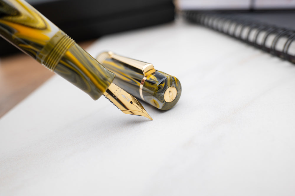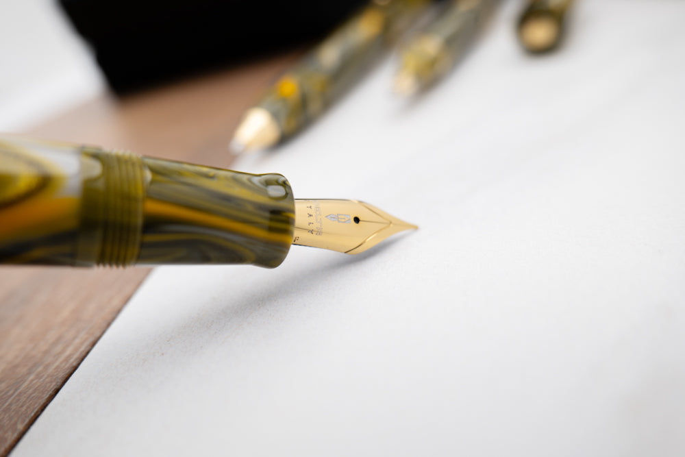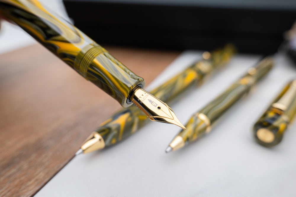 Select from these two unique resin mixtures in rich Iris purple or bright Marigold yellows and greens. Both resin blends are unique; no two are alike. Delta’s steel nibs lay down an effortless line of ink. Select from points sizes Extra Fine, Fine, Medium and Broad.