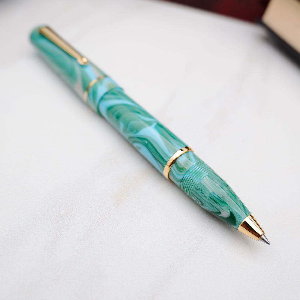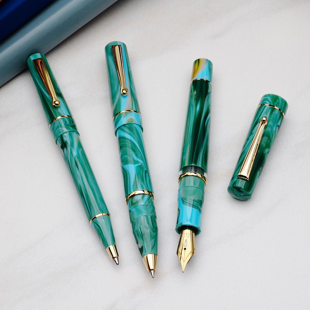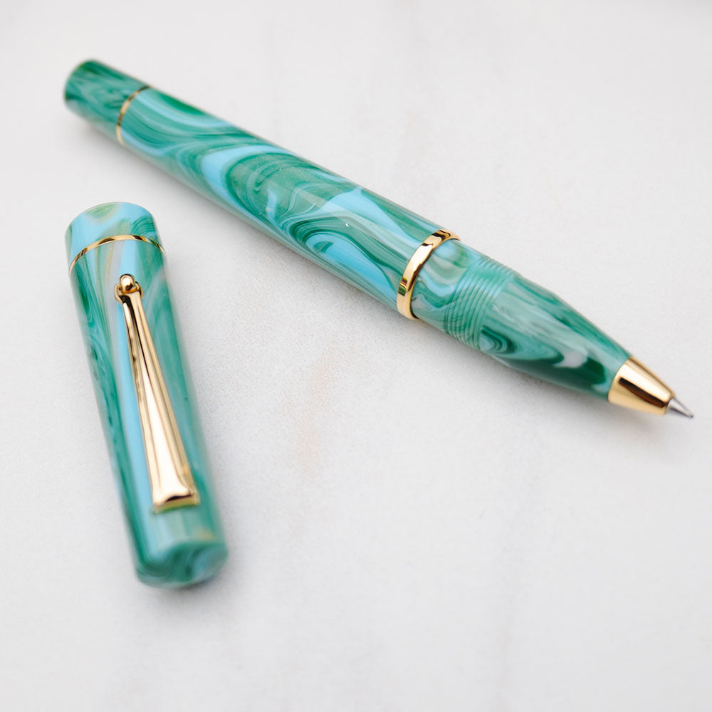 These three resin blends are unique; no two are alike. The rollerball is a liquid ink joy. Select refills in three points sizes and a rainbow of colors.