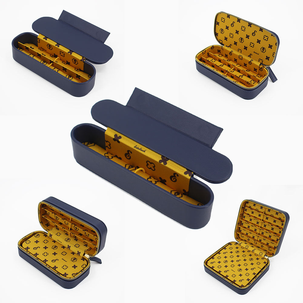 Smaller cases have a magnetic closure. Larger cases zipper to reveal your collection, which is housed in individual, cushioned sections, and secured with elastic for extra safekeeping.