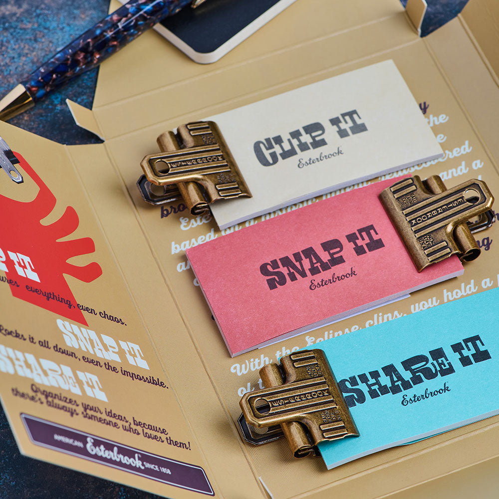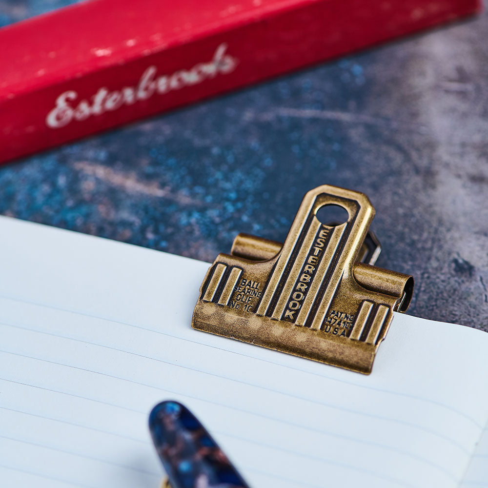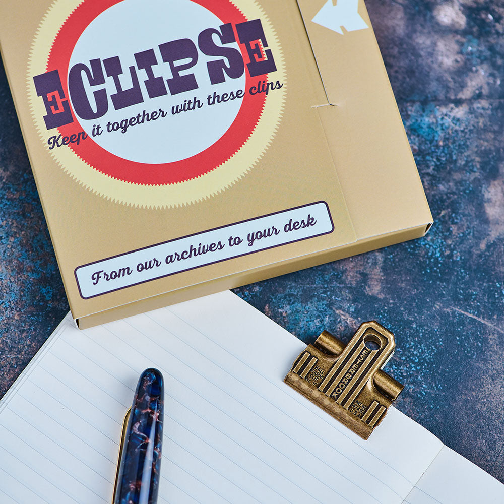 Meet Eclipse – the newest accessory from Esterbrook, reimagined from their archives of the early 1900s. These vintage-style page clips are modeled after original Esterbrook paper holders, crafted with a ball-bearing hinge and fine engravings, including the original patent number.