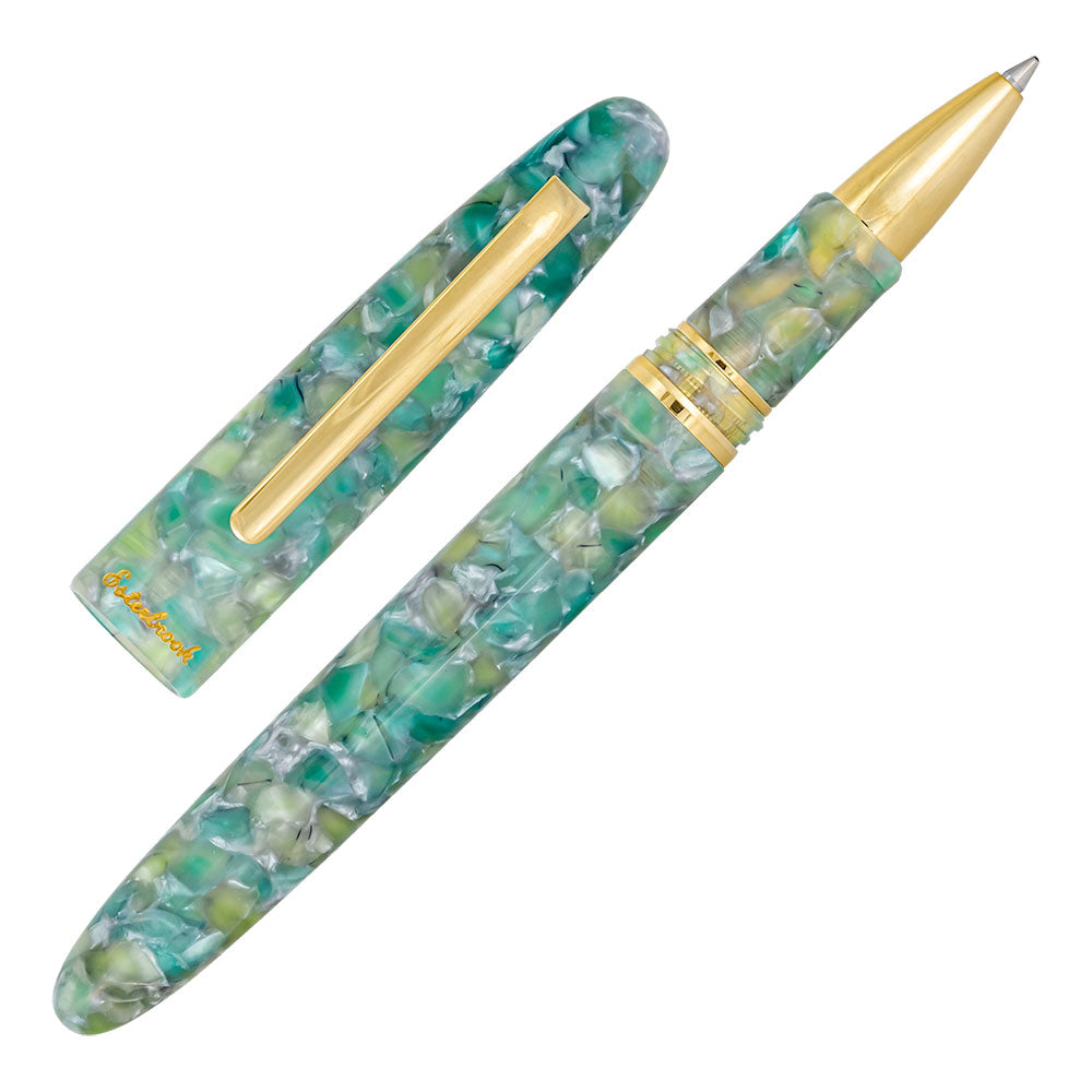 As a part of the Core Range, the comfortably balanced Estie Sea Glass is offered in fountain, ballpoint and rollerball in gold trim. The unique resin material is blended and turned with a Sea Glass mix of colors and then, given a highly-polished finish. A sleek clip provides a clean accent for the cap and slides easily to one’s shirt pocket.