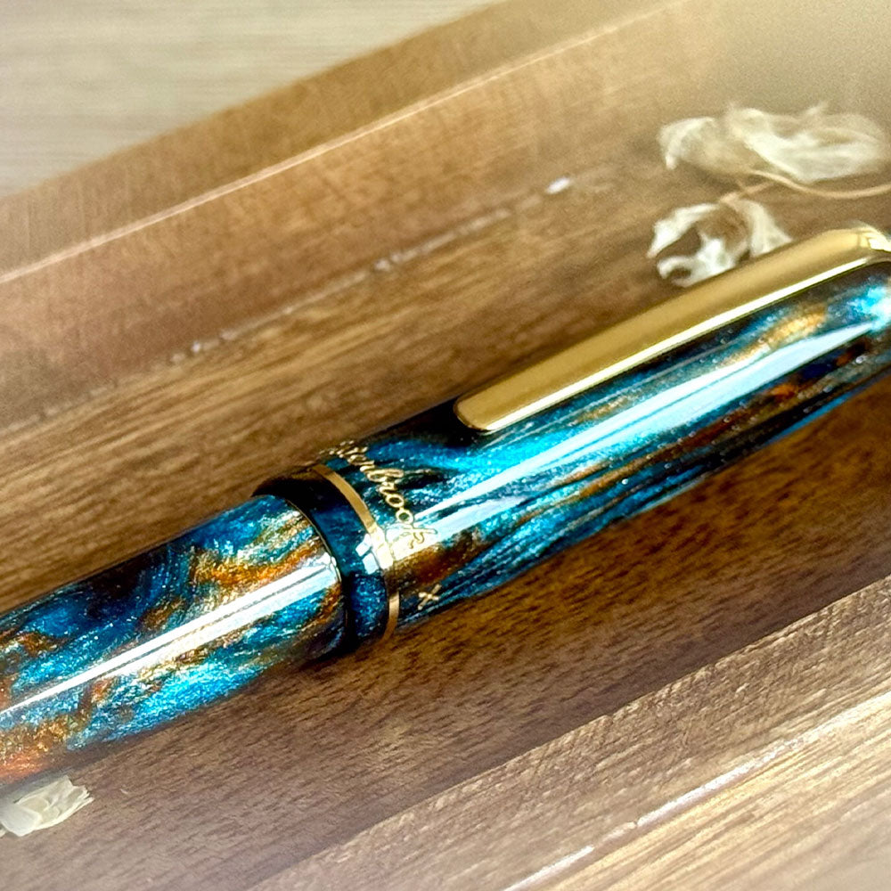 Crafted in the U.S. from DiamondCast resin, the Kingfisher Estie mirrors the bird’s vibrant feathers with deep teal, warm copper, and soft black hues. Gold-plated trim, a matching converter, and a special gold-plated nib engraved with the Japanese character for “bird” complete this refined writing instrument. Available in EF, F, M, and B, it offers a writing experience as exquisite as its design.