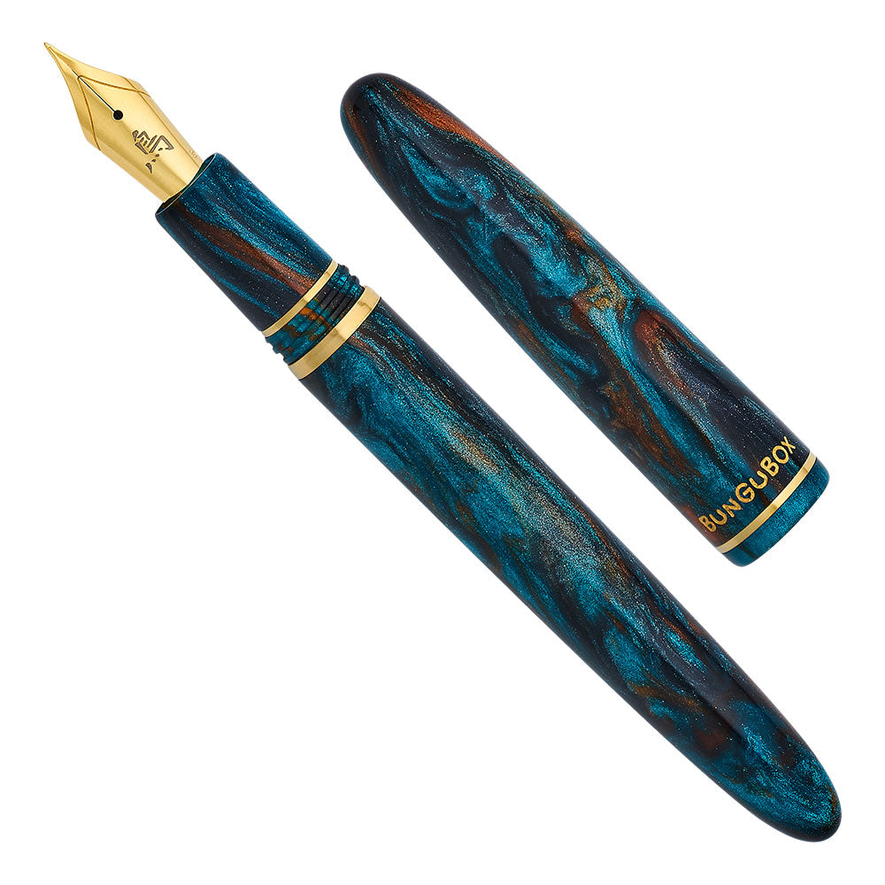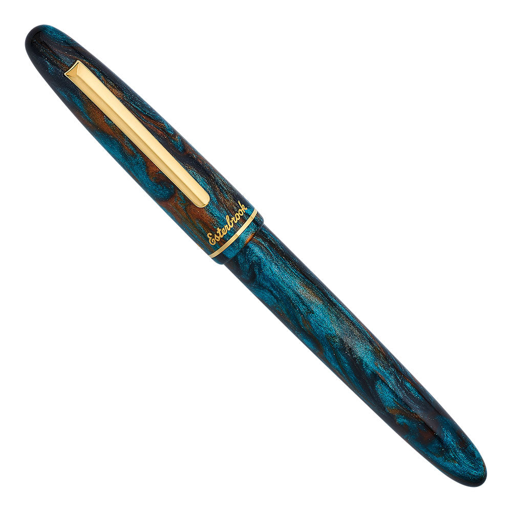 The Kingfisher Estie combines deep teal, warm copper, and soft black U.S. made DiamondCast resin for a bold, eye-catching look. Gold-plated trim and a specially engraved nib add a touch of refinement.