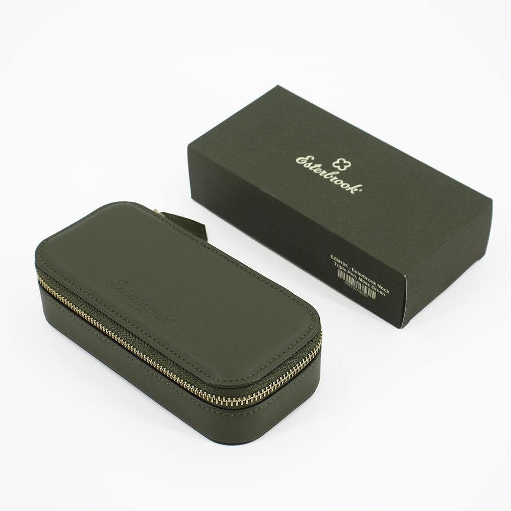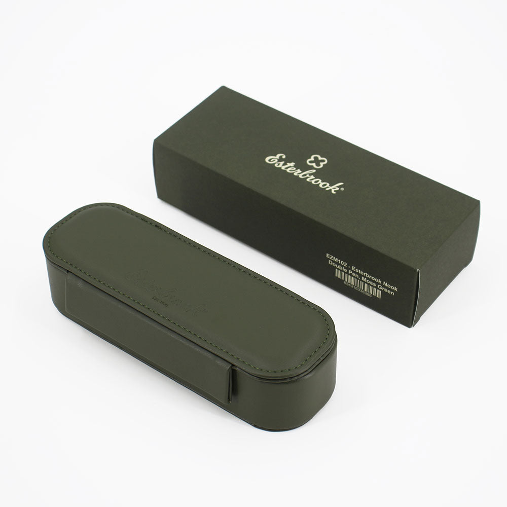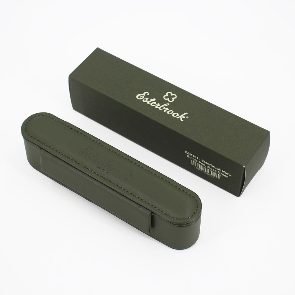Esterbrook paired supple Moss Green leatherette with matching stitching and then a fabric lined the interior with their signature Esterbrook Eternity image.