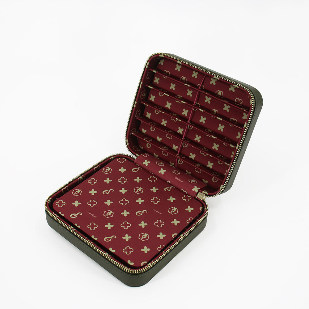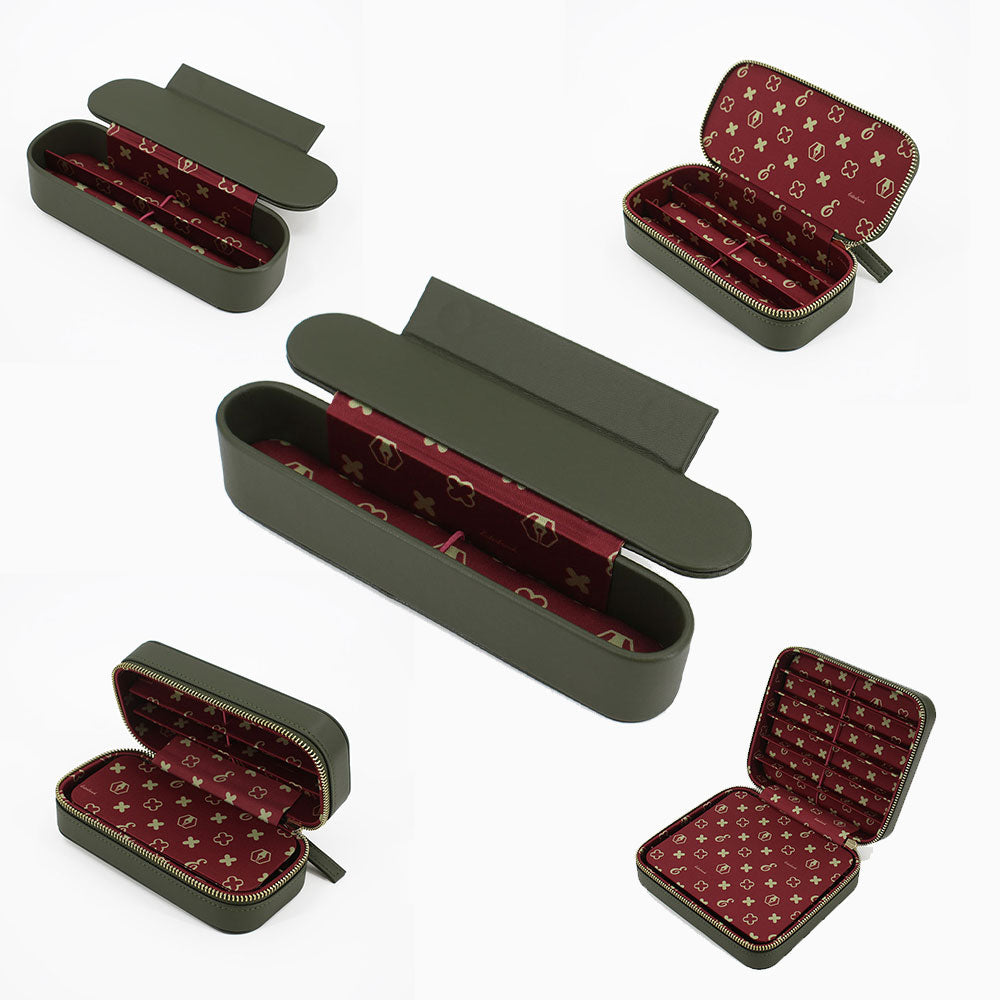 Smaller cases have a magnetic closure. Larger cases zipper to reveal your collection, which is housed in individual, cushioned sections, and secured with elastic for extra safekeeping.