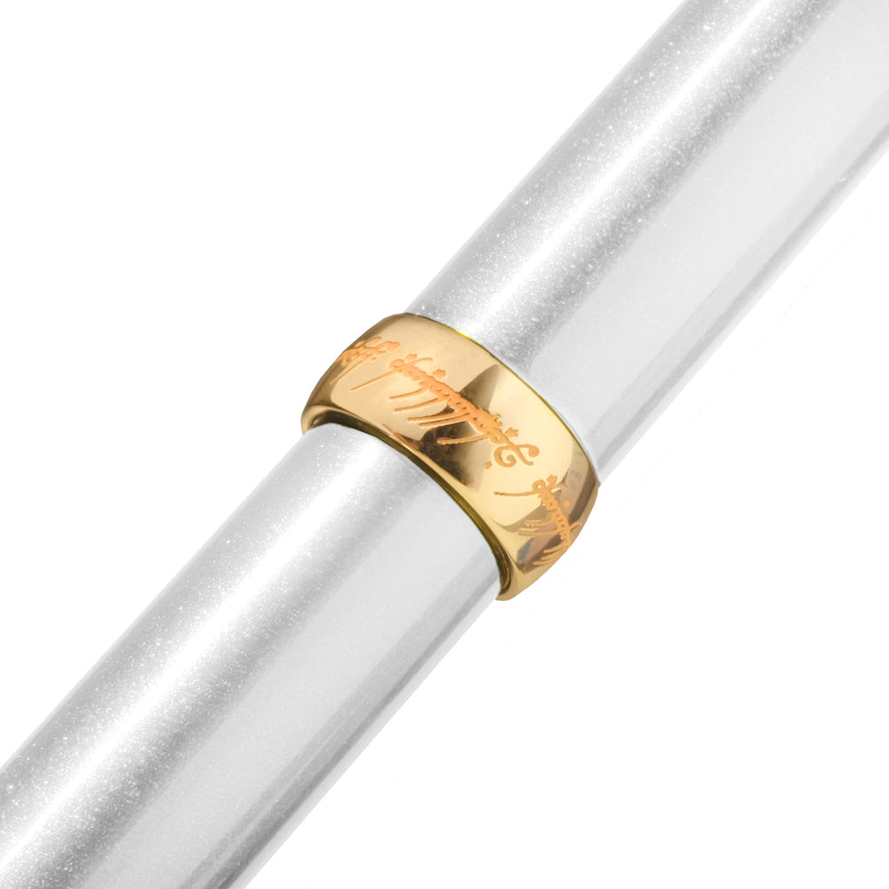 The Gandalf™ pen, representing Gandalf the White, has a silver-white metallic body. Its set includes Dawning Silver ink, a cool grey with a silver shimmer, inspired by the stormy skies over Helm’s Deep™.