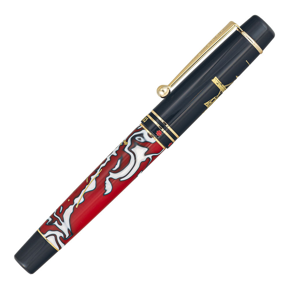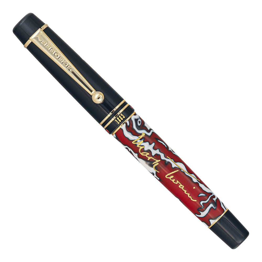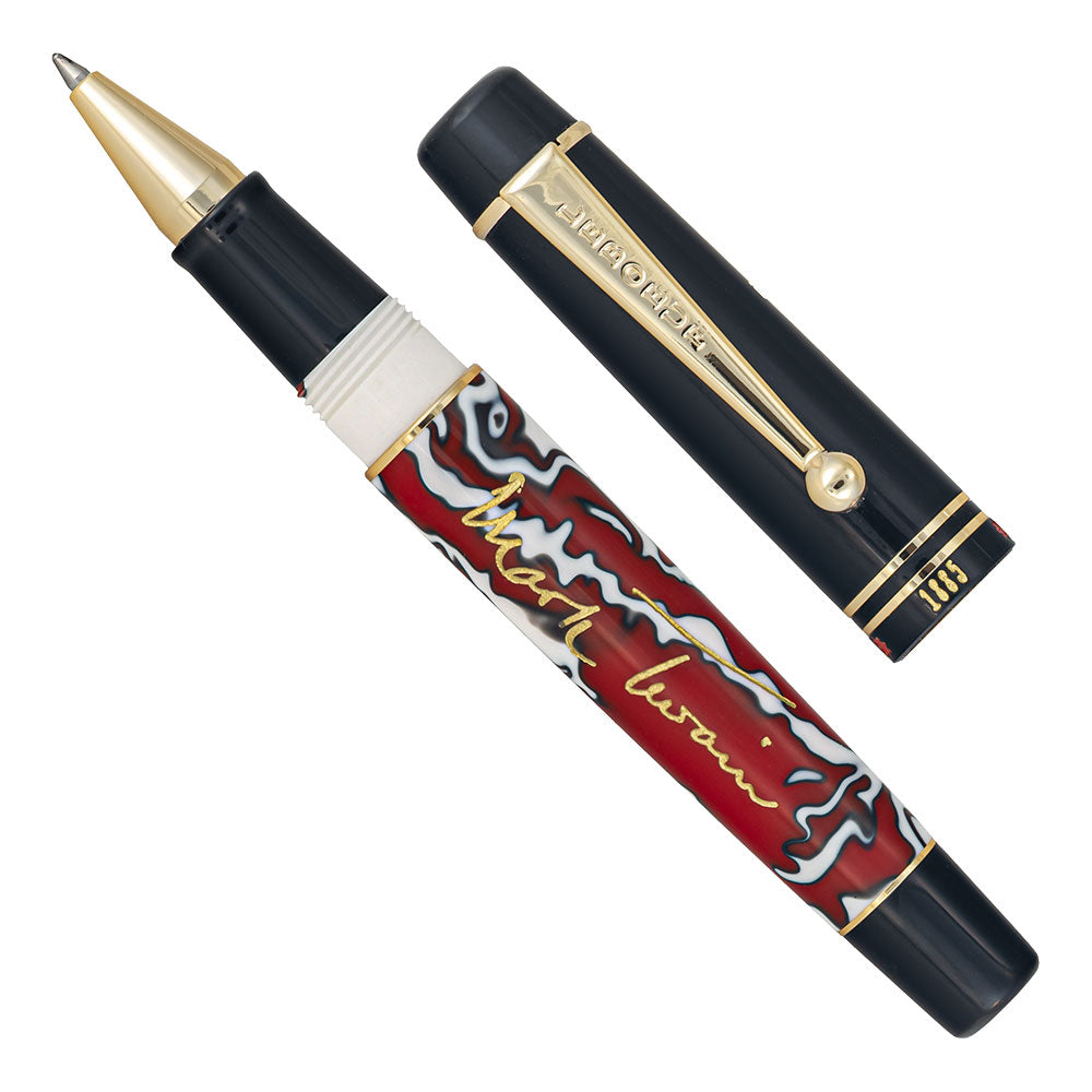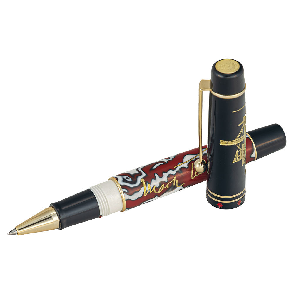 The Mark Twain “Huckleberry Finn” Limited Edition is produced with an exclusive acrylic named Hannibal Maroon Ivory Swirl. The material represents the colors of the steamboats featured prominently in many of Twain’s novels. Each pen barrel has been carefully polished and engraved with Mark Twain’s famous signature. A gold commemorative coin featuring a portrait of Mark Twain has been fitted onto the top of each cap.