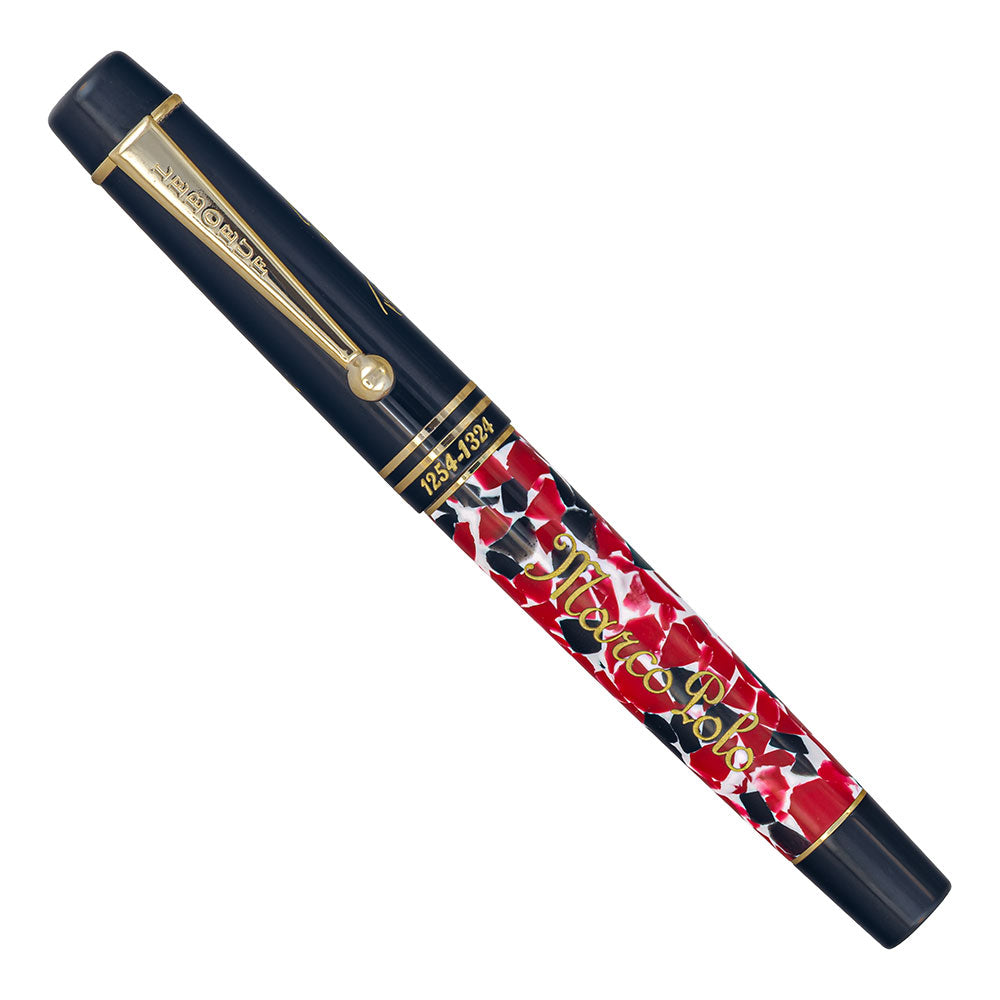Crafted with reverence to both history and artistry, this limited edition pen is a tribute to the spirit of discovery. The barrel, rendered in rich Silk Road inspired marbled resin, evokes the red sands and silks of ancient trade routes and features Marco Polo’s name elegantly engraved, in gold fill. The pen’s gold-plated trim mirrors the treasures of the empires Marco Polo encountered from the gilded courts of Kublai Khan to the bustling bazaars of Persia. Gold engraved camels adorn each cap representing Marco Polo’s long journey over the Silk Road.