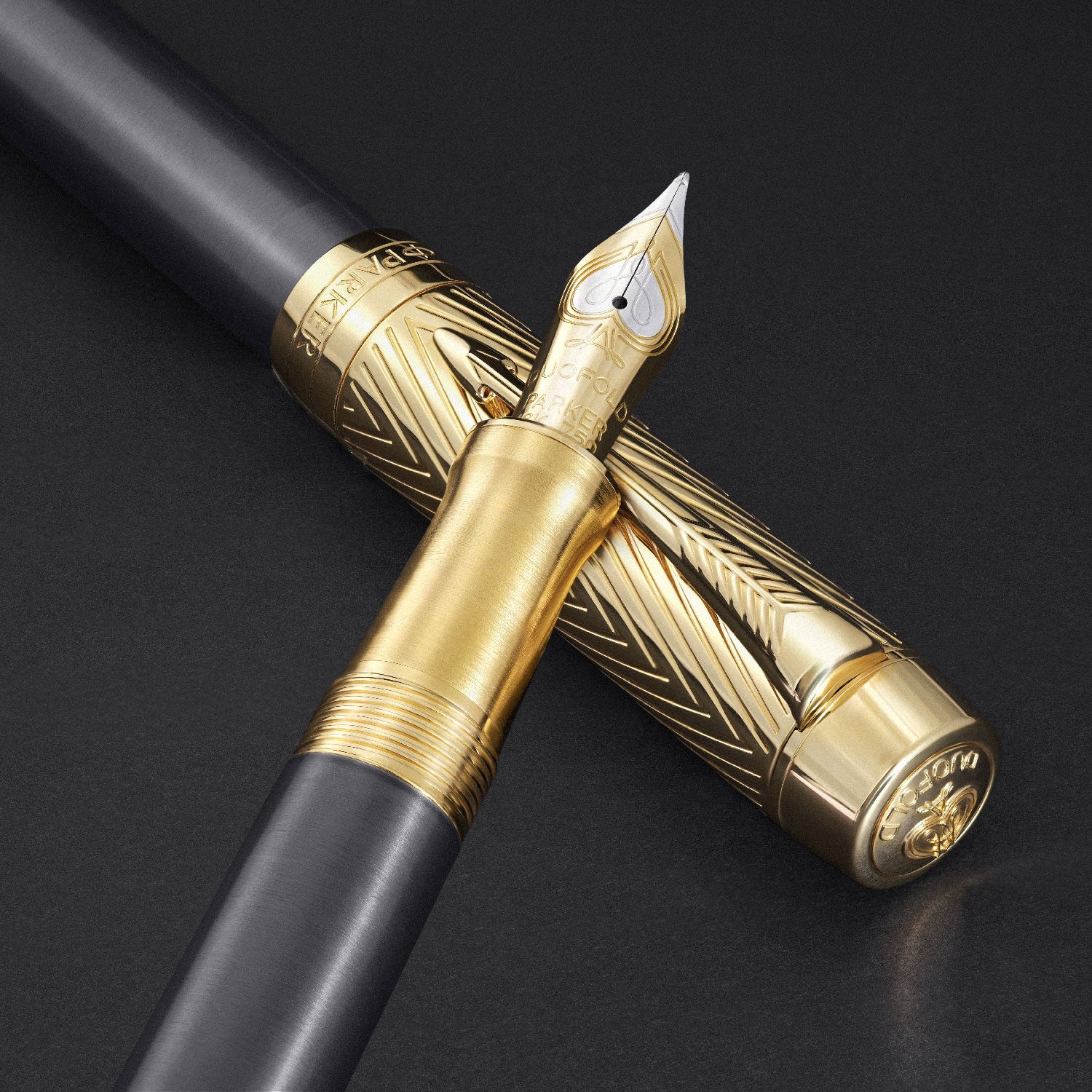 This Special Edition Duofold features an 18k solid gold bi-tonal rhodium-plated nib with the iconic ace design. Nib choices are fine or medium. This nib is the finest example of Parker’s well deserved fine writing reputation. Complemented by grey lacquer on the barrel and 23-carat gold plated cap & trims.