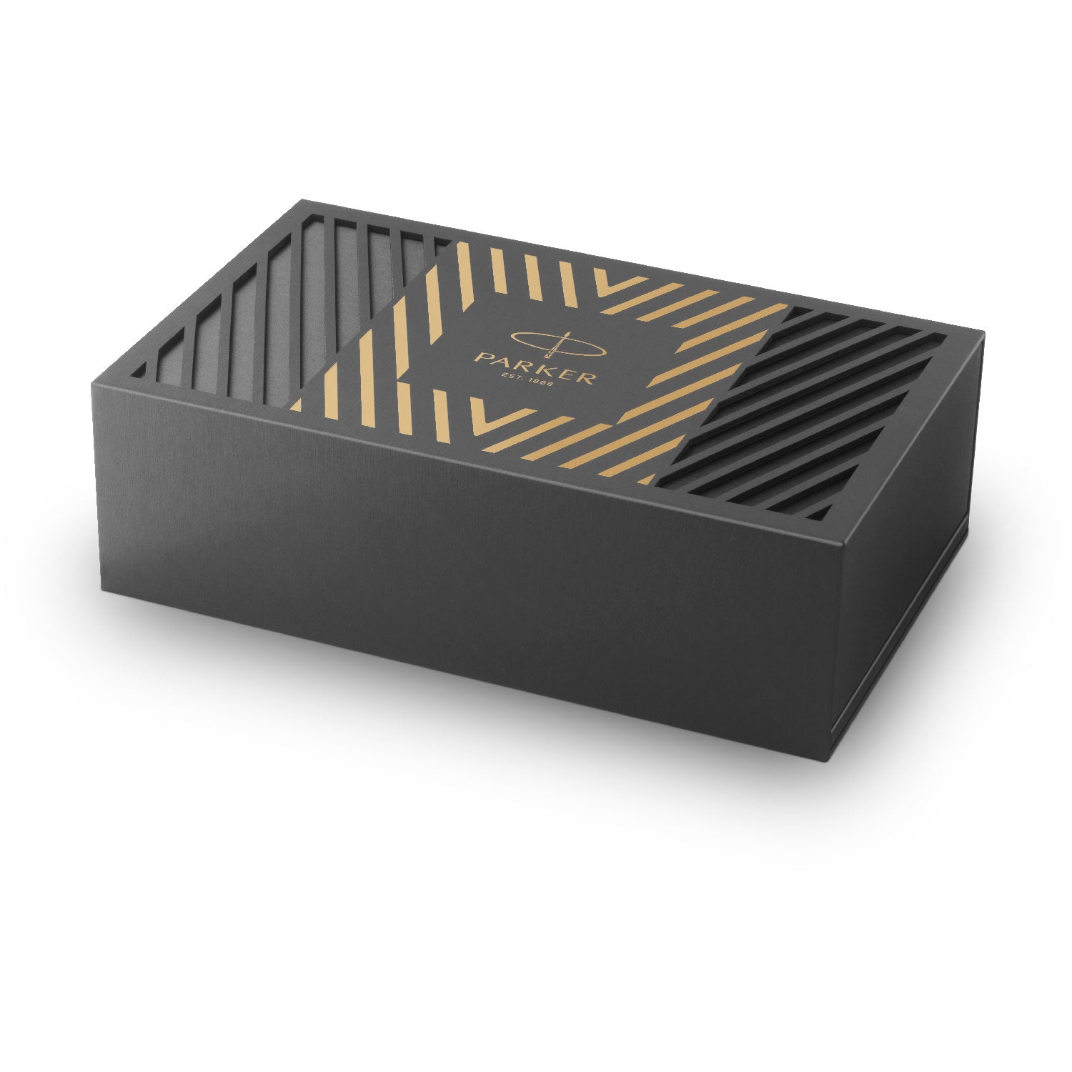 The Centennial Size fountain pen is comprised of 22 components, individually hand assembled. This Parker Duofold Arrow Special Edition is presented in a bespoke gift box which compliments the grey and gold design and incorporates the chevron pattern into the intricately designed lid. Alongside the Duofold, the gift box holds a specially designed genuine leather pen pouch, a box of 5 long black cartridges and the warranty leaflet.