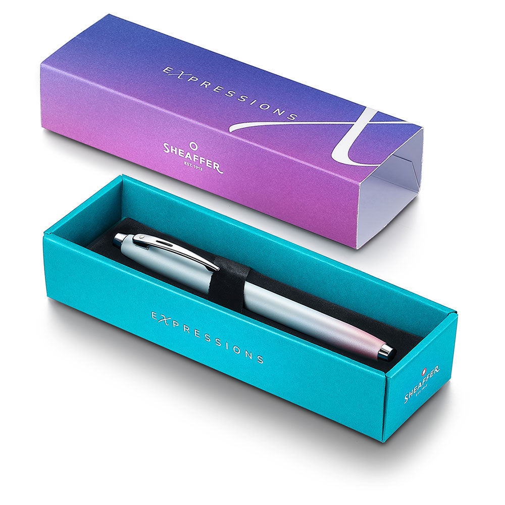 Designed for those who write boldly and live vividly, Expressions introduces a fresh, unapologetic look to the Sheaffer range. The collection features the 100 Series fountain pens, rollerballs, and ballpoints in a modern gradient finishes—This 100 Series is seen in Blue & Pink gradient. It has chrome-plated trim, a durable brass body, and Sheaffer’s trusted writing performance. Each pen comes in a premium, plastic-free gift box made from FSC-certified paper.