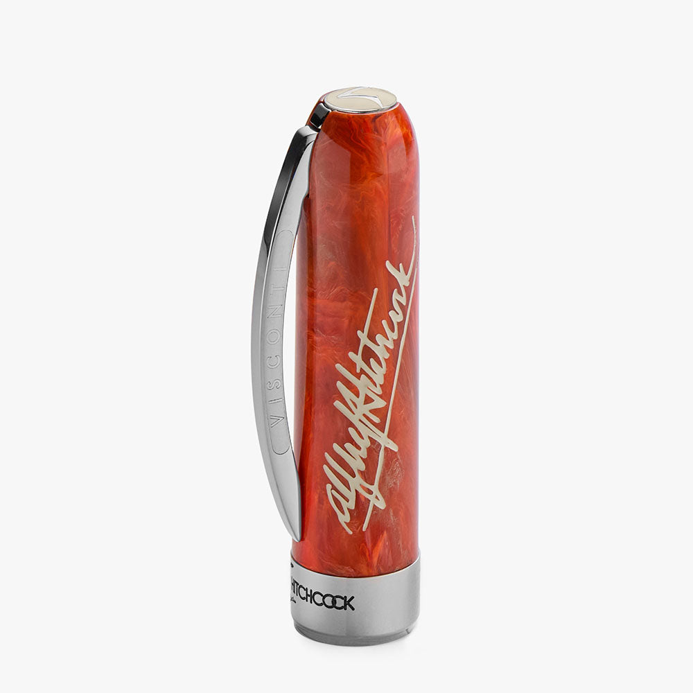 In homage to Hitchcock's singular authorial identity, the cap features a finely engraved and enameled reproduction of his signature, affirming the creative authority of a director whose influence reshaped cinematic storytelling. The design is further refined by the polished palladium metal accents, distinctive white-enameled Visconti finial, and a specially crafted central ring - engraved and enameled with both the Visconti logo and Hitchcock's iconic profile, alongside the emblem of the Hitchcock Foundation.