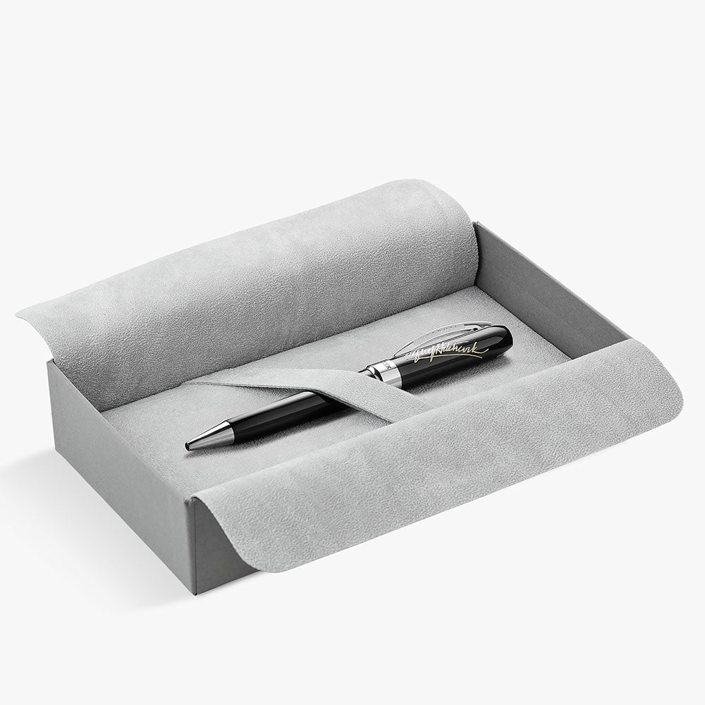 These pens - crafted as fountain pens, rollerballs, and ballpoints - feature a classic, traditional design inspired by the unmistakable aesthetics of 1960s cinema. The pen's body is formed from sleek black resin, with palladium accents that provide a refined black -and-white contrast reminiscent of Hitchcock's signature visual style. This understated design is intended not only to evoke mystery and drama but also to serve as a tool that inspires creativity, enabling the user to give life to new worlds, dreams, and works of art.