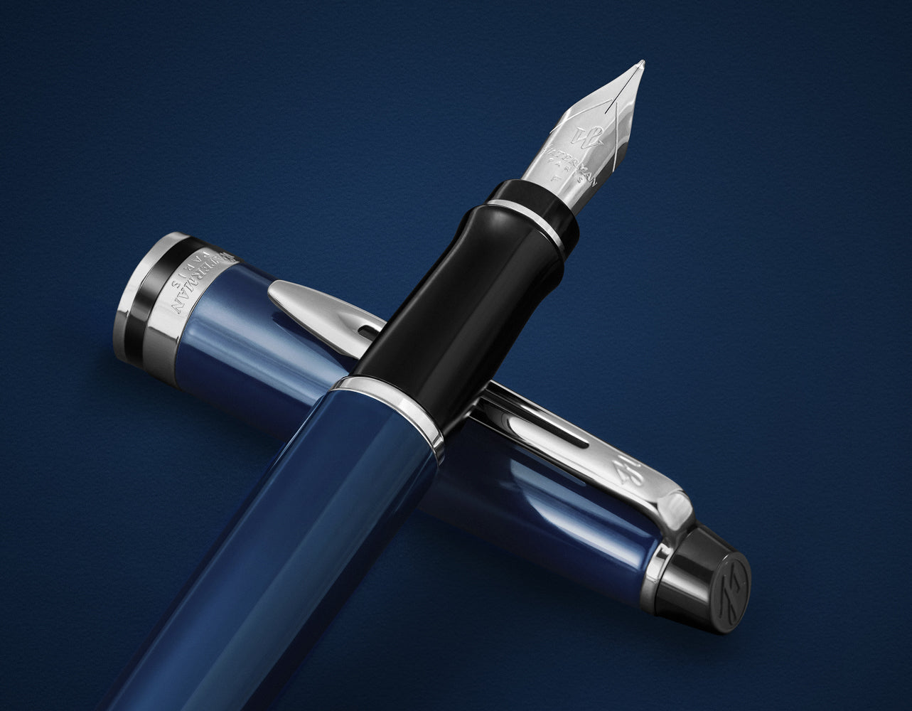 Elevate your working day with the exquisitely designed Expert Core Blue fountain pen. Expert’s instantly recognizable tapered silhouette combined with Waterman's signature deep blue color. This emblematic lacquer finish on both cap and barrel blend seamlessly with Waterman's exquisite craftmanship to deliver the epitome of sophistication. It is perfectly complemented by the palladium-coated two prong clip and trims, and black, resin shell, all combining to evoke the spirit of Waterman. This premium pen offers the perfect balance of effortless writing with a confidently Parisian charm.