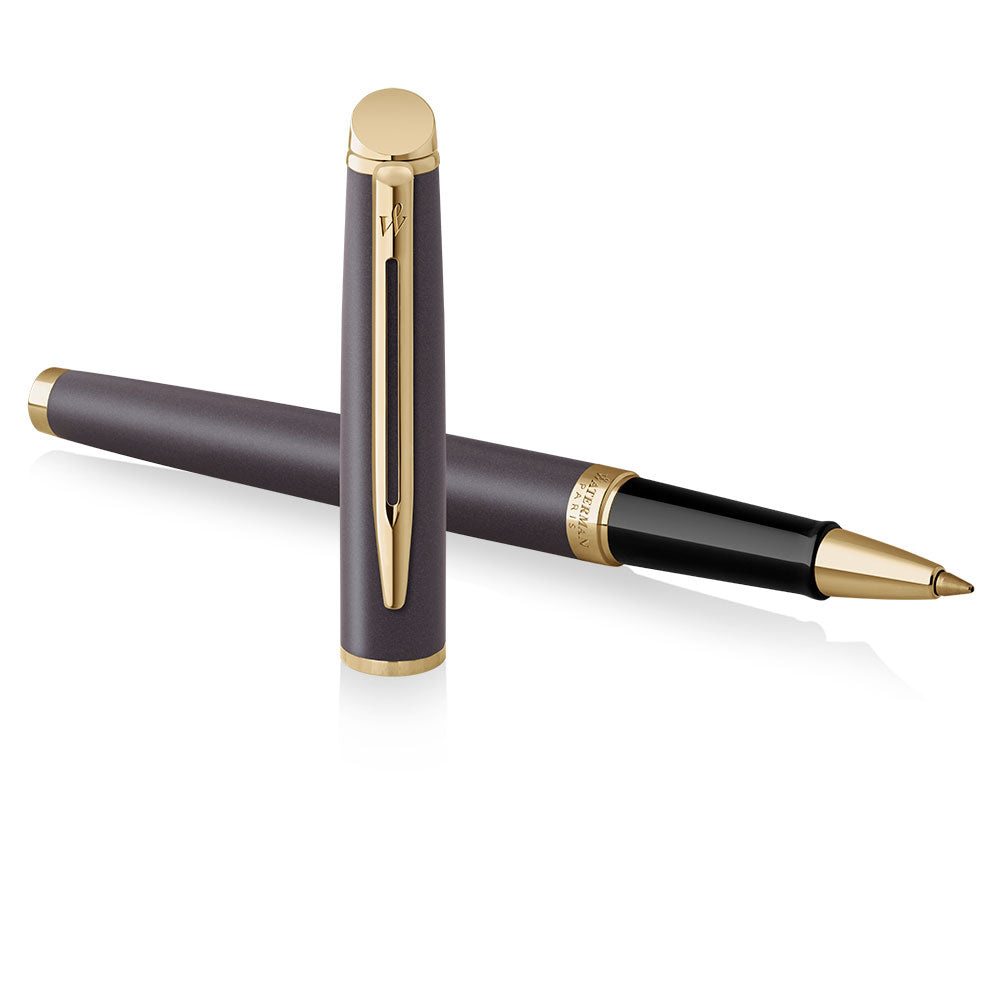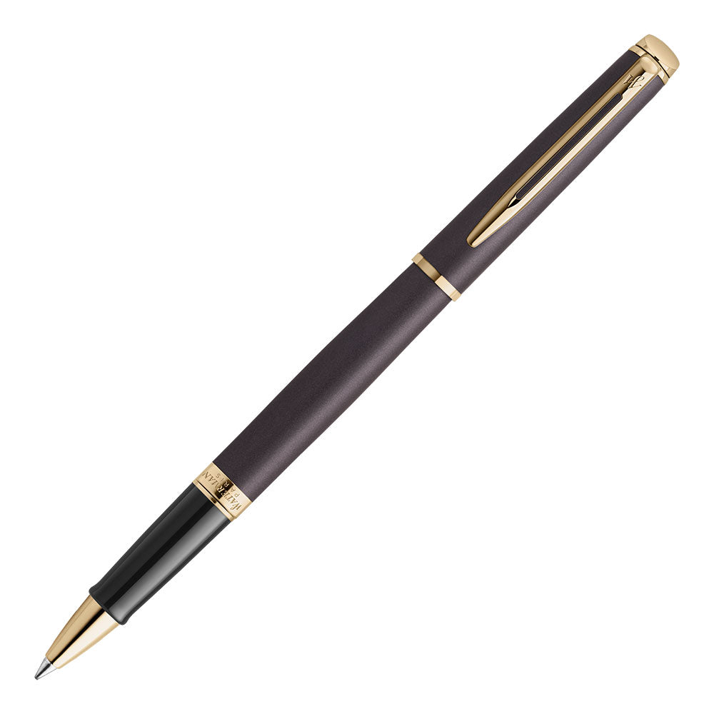 The Waterman Hémisphère Lava Black rollerball exemplifies refined craftsmanship and timeless elegance. Its sleek metallic matte black lacquer finish is complemented by light 23k gold-plated trim, creating a sophisticated aesthetic suitable for any occasion.